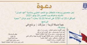وكشفت الدعوات التي وزعها مجلس مدينة ديمونا الإسرائيلية، ونشرها على نطاق واسع بمواقع التواصل الإجتماعي، أن مراسيم الاحتفال بذكرى عيد العرش المغربي الذي يصادف هذه السنة الذكرى الـ22 لتربع الملك محمد السادس على كرسي العرش، ستجرى ابتداء من الساعة السادسة من مساء هذا اليوم الخميس بالتوقيت المحلي لإسرائيل، بمنتزه” دودو- دوتان” المشهور بمدينة ديمونا.