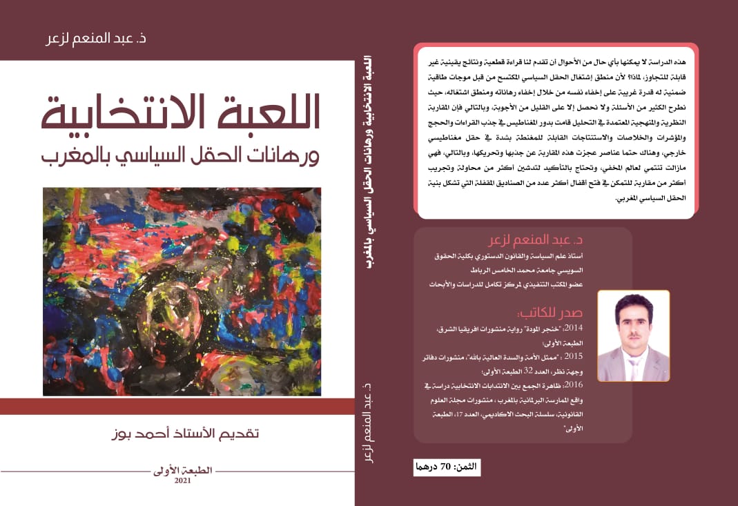 صدر خلال شهر ماي الماضي عن مطبعة”شمس برينت”بسلا، الطبعة الأولى من الكتاب الجديد للدكتور عبد المنعم لزعر، أستاذ علم السياسة والقانون الدستوري بكلية الحقوق السويسي جامعة محمد الخامس الرباط، اختار له موضوع”اللعبة الانتخابية ورهانات الحقل السياسي بالمغرب”، والكتاب الذي جاء في 276 صفحة من الحجم المتوسط ، هو من تقديم الدكتور أحمد بوز أستاذ علم السياسة والقانون الدستوري ومنسق ماستر الأداء السياسي والمؤسسات بكلية الحقوق السويسي جامعة محمد الخامس الرباط.